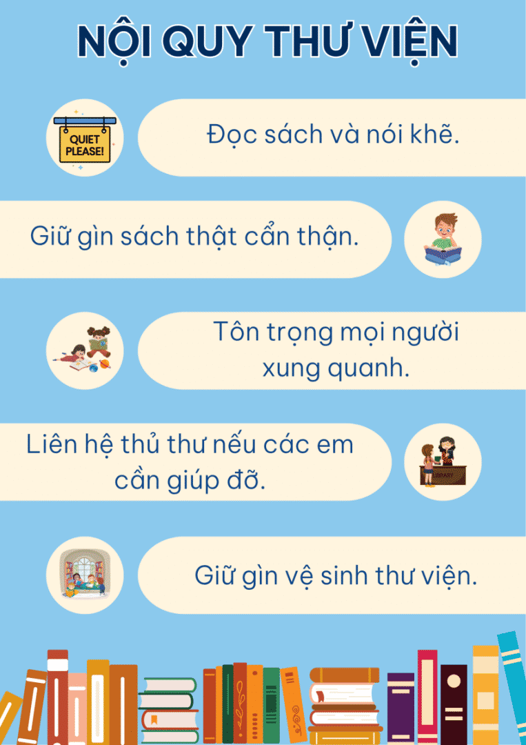 Trong thư viện của trường Tiểu học, mỗi học sinh đều phải giữ cho không gian yên tĩnh, tôn trọng sách và mọi người xung quanh. Việc trả sách đúng hạn và tình thần tự học là vô cùng quan trọng. Các em học sinh sẽ được hòa mình vào thế giới của tri thức, nơi nảy mình giữa những trang sách màu hồng và xanh, mang theo mùi của giấy in và cây viết mới mỗi khi bước chân vào.